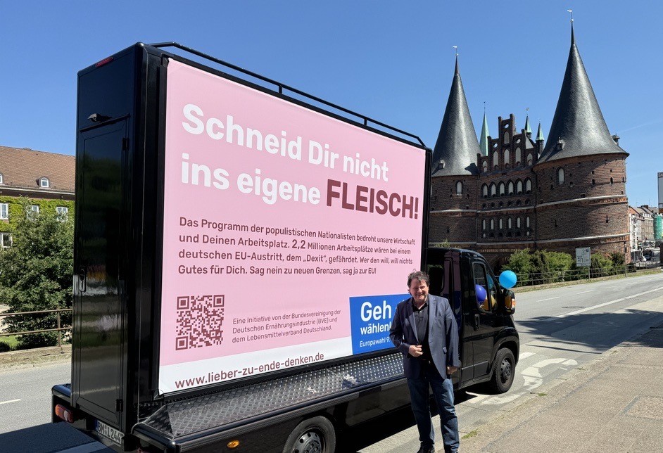 Lübeck, 13. Mai 2024 – Die heiße Phase der Pro-Europa-Kampagne #LieberZuEndeDenken hat offiziell begonnen. Christoph Minhoff, Hauptgeschäftsführer der Bundesvereinigung der Deutschen Ernährungsindustrie e.V. (BVE), eröffnete die Kampagne mit der ersten Station ihrer Deutschlandtour in Lübeck. Die Kampagne, eine Initiative der deutschen Lebensmittelwirtschaft, nutzt mobile Plakatwände, um wichtige Botschaften zur Europawahl am 9. Juni durch das Land zu tragen.